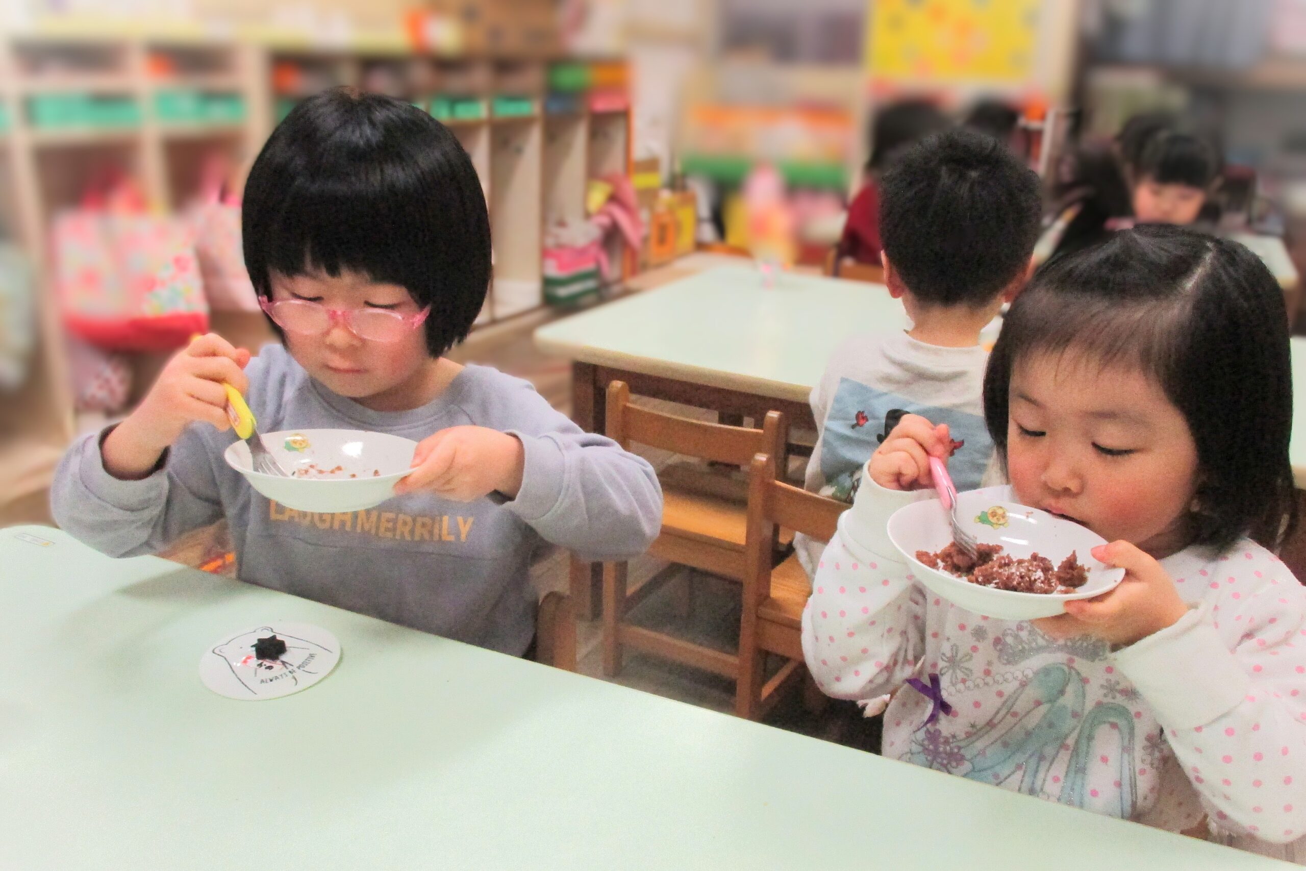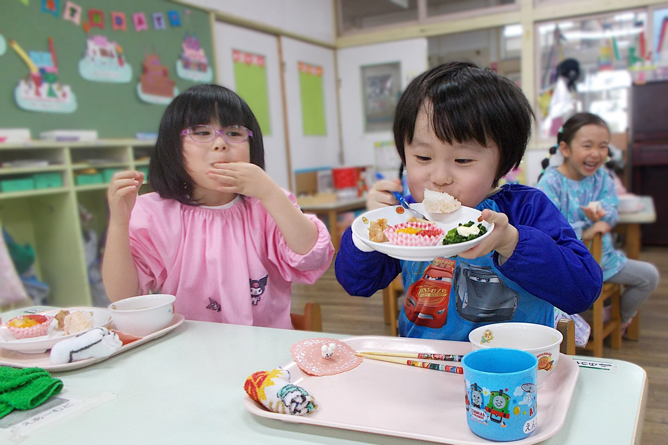 給食の先生が作ってくれた愛情いっぱいの給食をみんなで食べます。