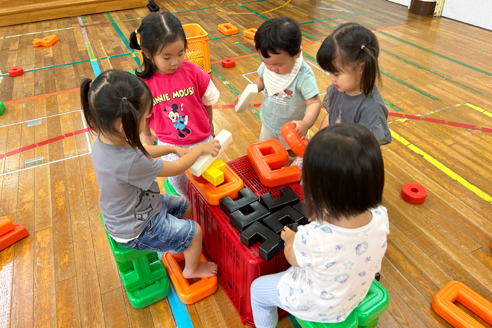 園で用意したおやつをみんなで食べ、ちょっとひと休み。今日はどんな遊びをするのかな~?保育室だけではなく、自然いっぱいの園庭で思いっ切り遊びます