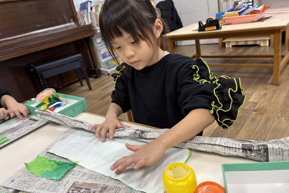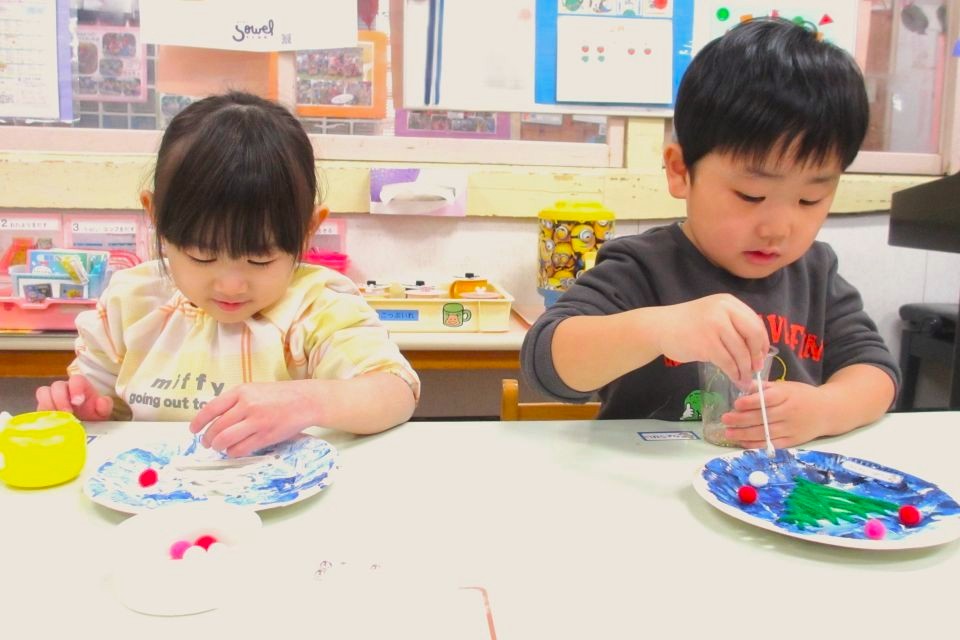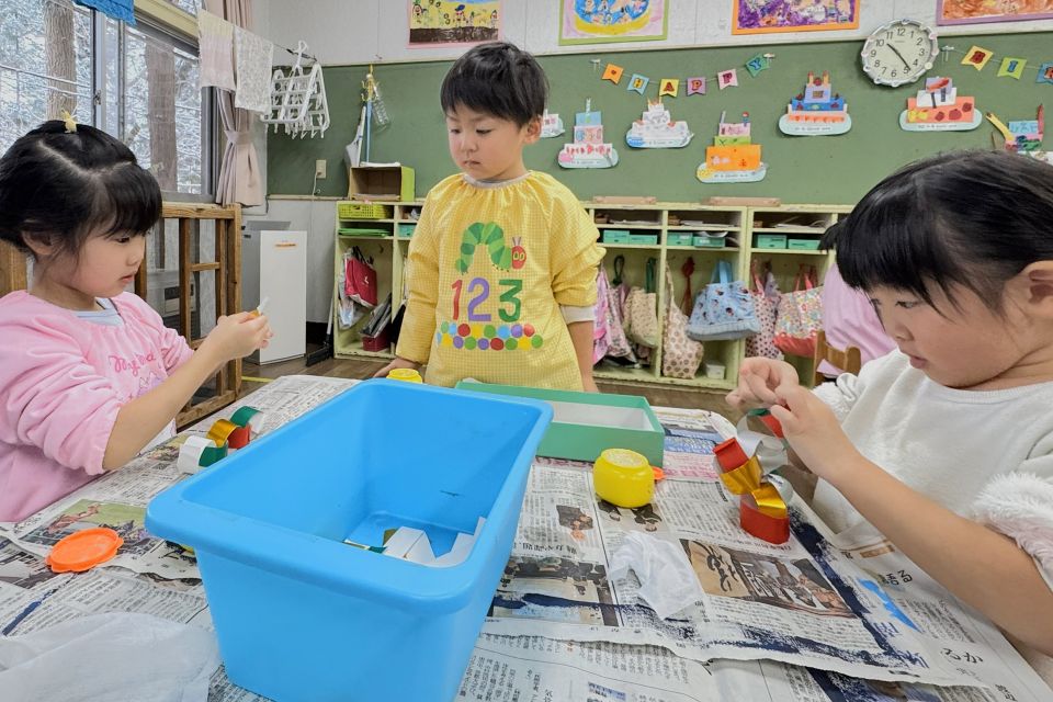 クリスマス会に向けて、もも組と一緒に「わっ飾り作り」をしました🎄年下のお友だちに教えている様子です✨