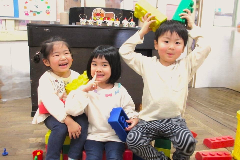 ブロックで椅子を作り、休憩中の子どもたち👦🏻👧🏻🎵
