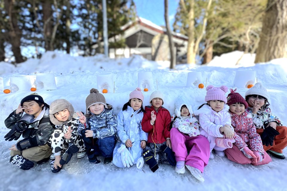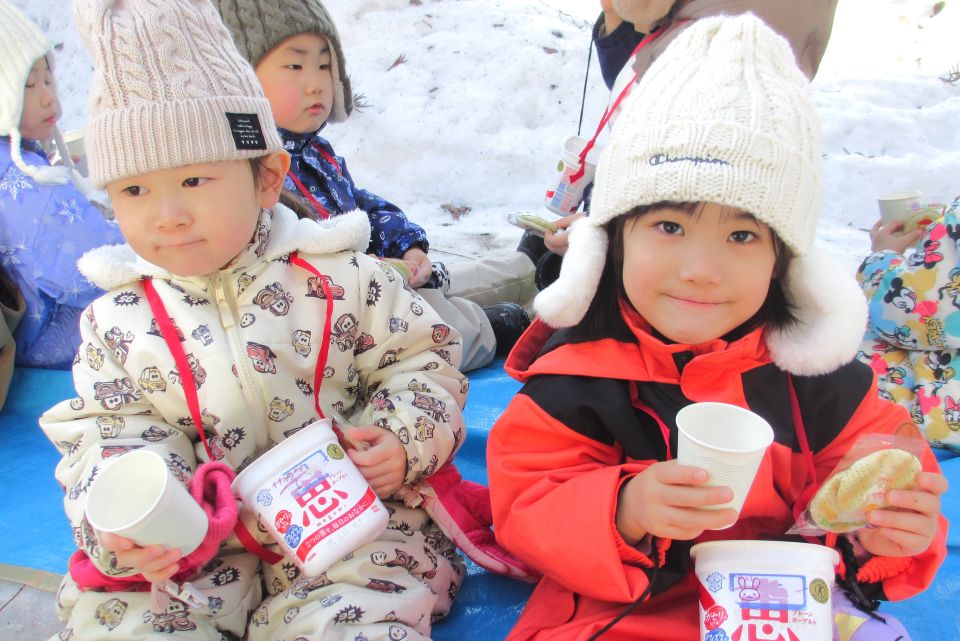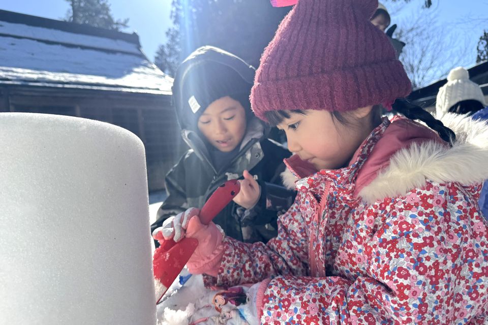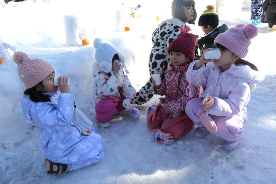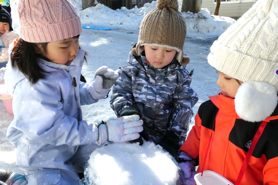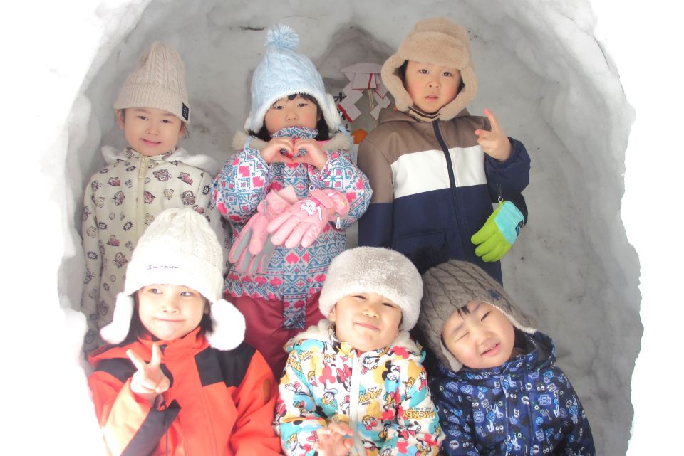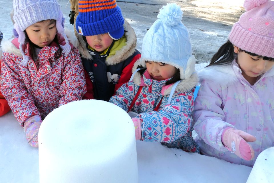 2月13日(金)にかまくらごっこを行い、3歳以上児合同グループでミニかまくら作りをしました❄️園庭から雪を運ぶ子、バケツに雪を入れて固める子、慎重に穴を掘る子など、年長児がリードして役割分担をしながら、みんなで協力して作ることを楽しんでいた子どもたちです🪣☃️かまくらの前で甘酒を飲んだり、水神様に手を合わせたりして、みんなで横手市の伝統行事に親しむことができました☺️夜にはライトアップされ、幻想的な雰囲気を味わっていた子どもたちでした👀🔦✨