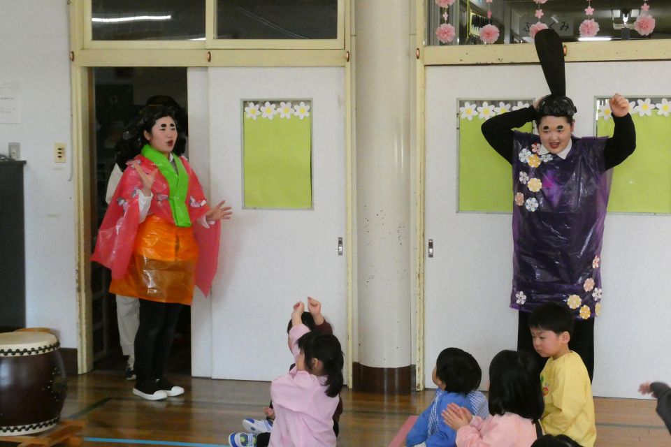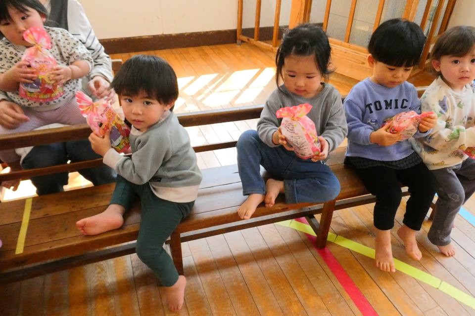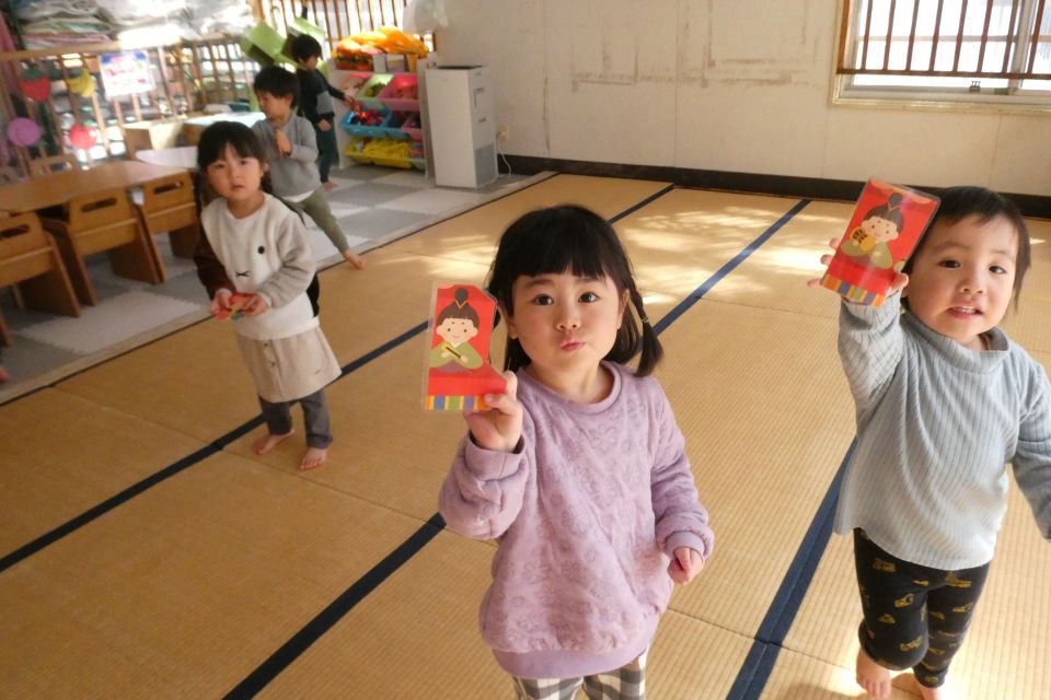 3月2日(月)にひなまつり会がありました。今年はお雛様とお内裏様が登場❗🎎三人官女も加わって、笛や太鼓などの楽器で『うれしいひなまつり』を演奏してくれました🎵カード探しゲームでは、園内に隠された雛飾りのイラストカードを見つけようと、気合十分な子どもたち✊🏻🔥中々見つけられないときは、友だちと協力して探す姿が見られましたよ🧑🏻🤝🧑🏼🫱🏻🫲🏻無事に探し出すことができた子どもたちは、お雛様とお内裏様からひなあられをもらい大喜びでした💕楽しいひなまつりとなりました❕