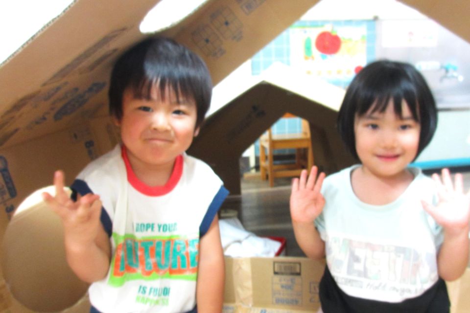 ダンボールテントで遊んでいるよ✨キャンプごっこが始まるよ~!