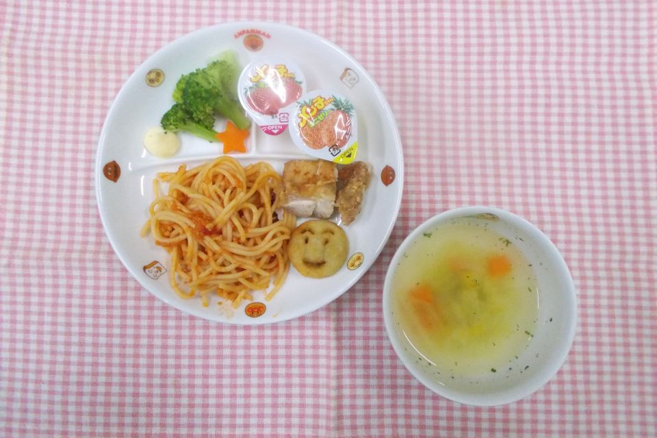 お誕生会特別献立🎂ミートソーススパゲティ・からあげ・ポテト・温野菜・コンソメスープ・ミニゼリー