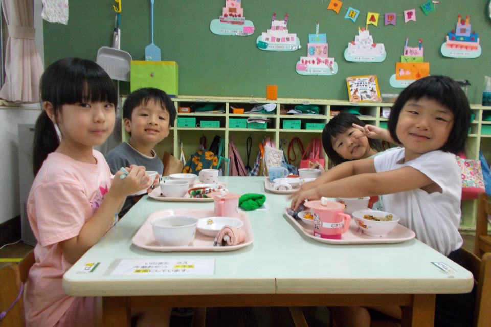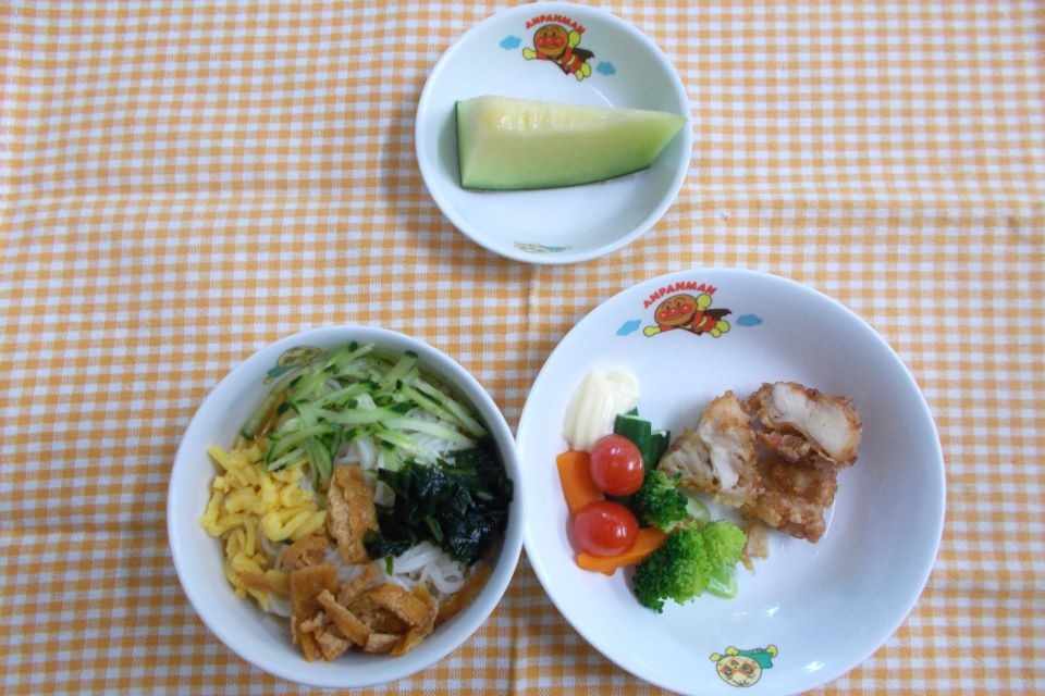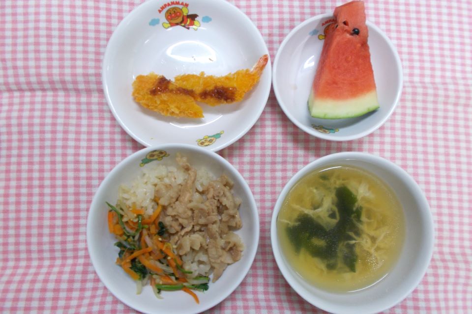 お誕生会お楽しみ献立🎂ビビンバ丼・エビフライ・たまごスープ・すいか