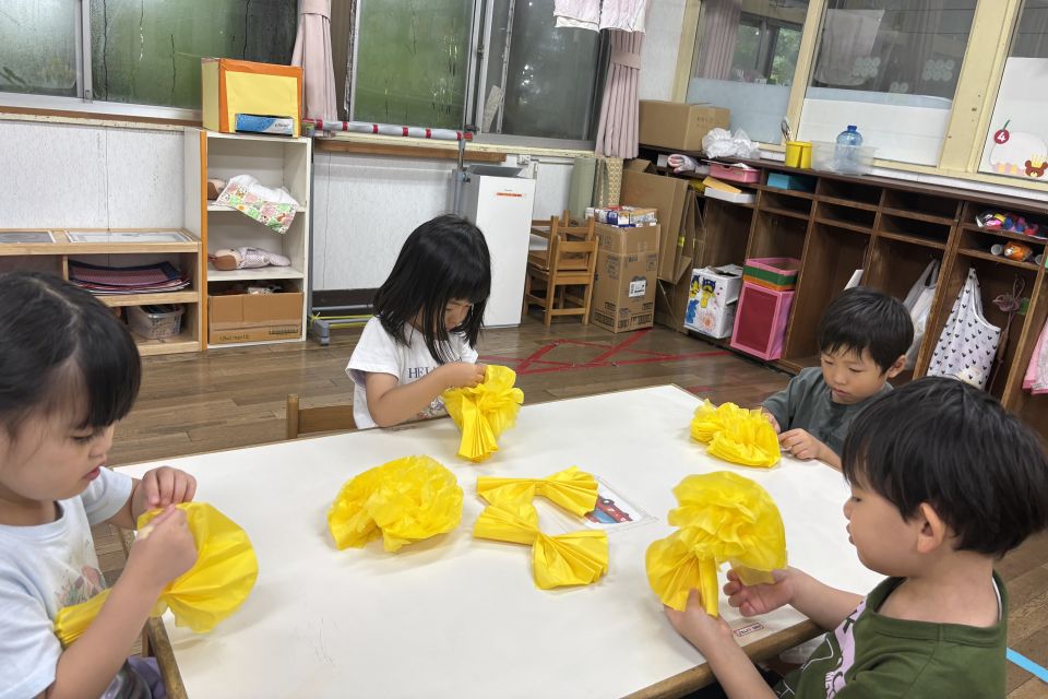 おみこしの製作風景です!子どもたちが一つ一つお花を作りました🎶