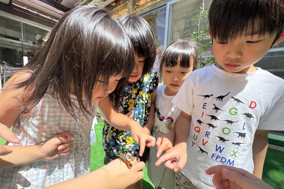 水やり中に見つけた「セミの幼虫‼️」羽化の瞬間をみんなで見ることができました🔍次の日、外に返しました👋🏻
