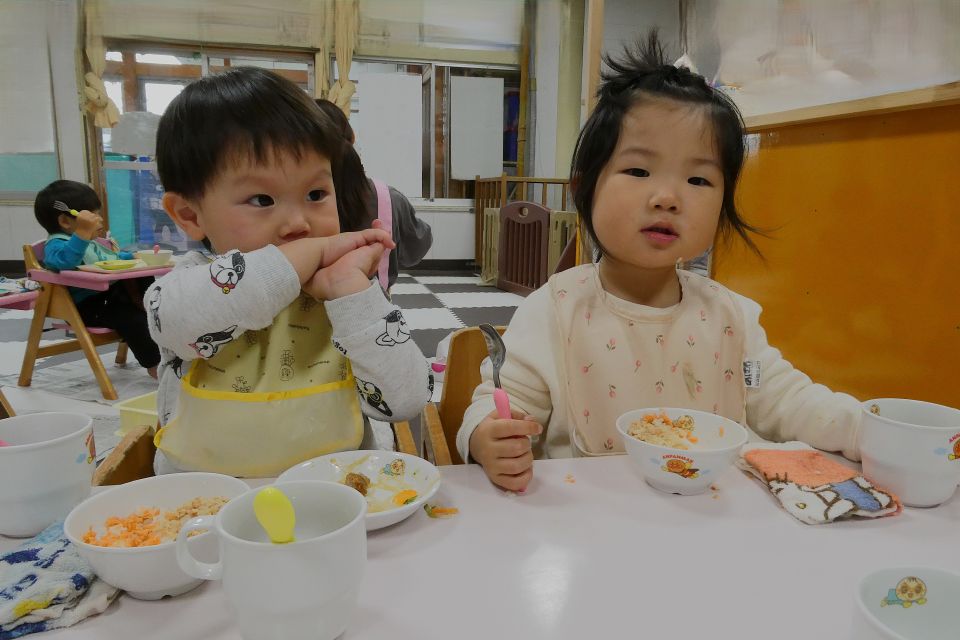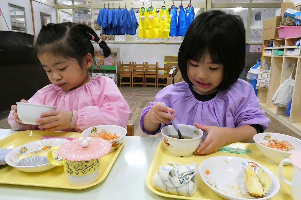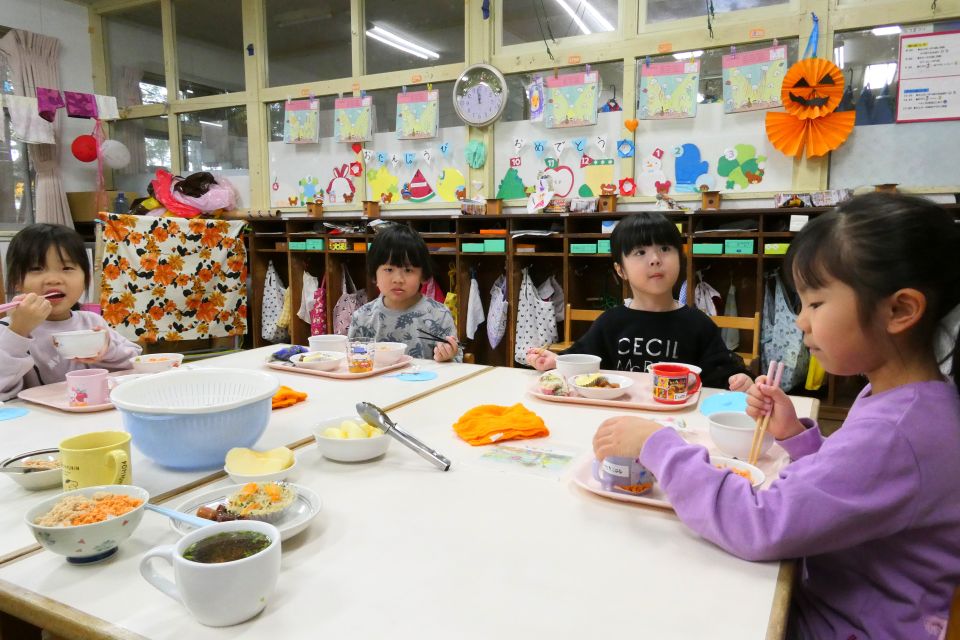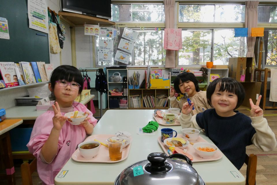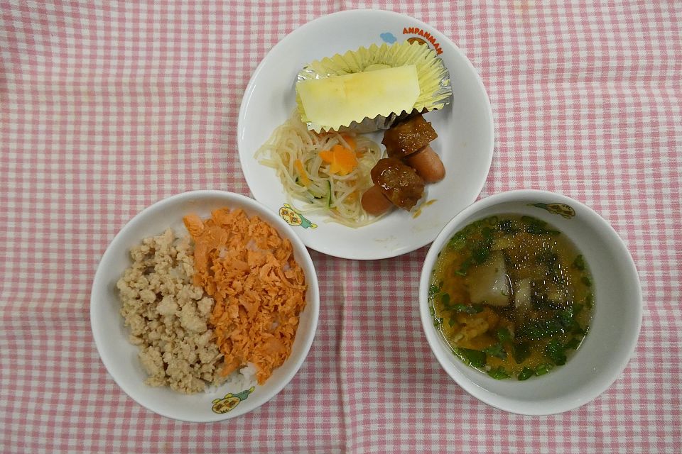 お誕生会特別献立🎂 2色ご飯・きのこウインナー・春雨サラダ・いものこ汁・りんご